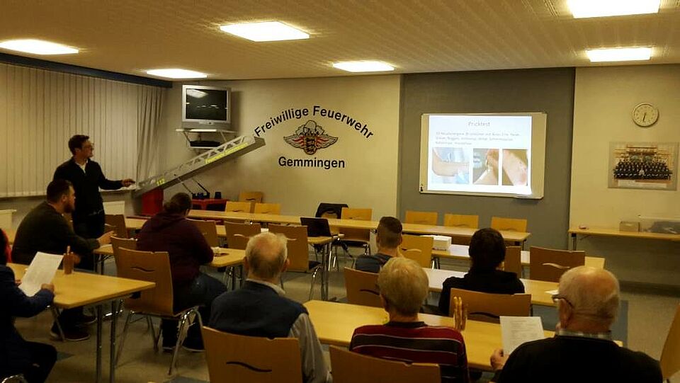 Bei einem Dienstabend des DRK Ortsverein Gemmingen hielt Dr. Michael Klimm einen interessanten Vortrag zum Thema Allergien im Feuerwehrhaus. Unter den knapp 20 Zuhörern waren neben Rotkreuzlern auch einige Interessierte aus der Bevölkerung.