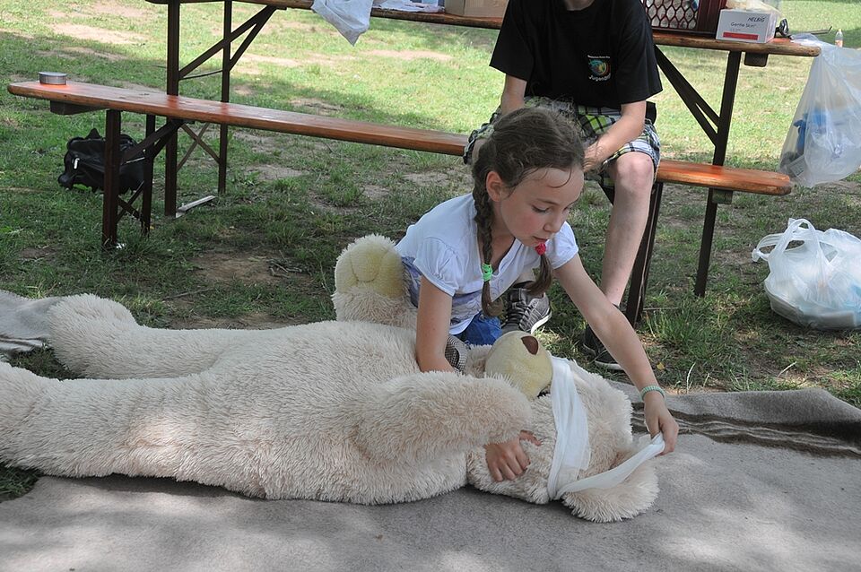 „Hallo, kannst du mir mal helfen? Schau, dieser Teddy braucht deine Hilfe!“ Jugendrotkreuz-Gruppenleiter sprachen die Teilnehmer an. Schnell fanden sich viele helfende Kinder, die den verletzten Bären versorgen und trösten wollten. Es wurde gezeigt, wie man Verbände anlegt, der „Patient Teddybär“ war geduldig.