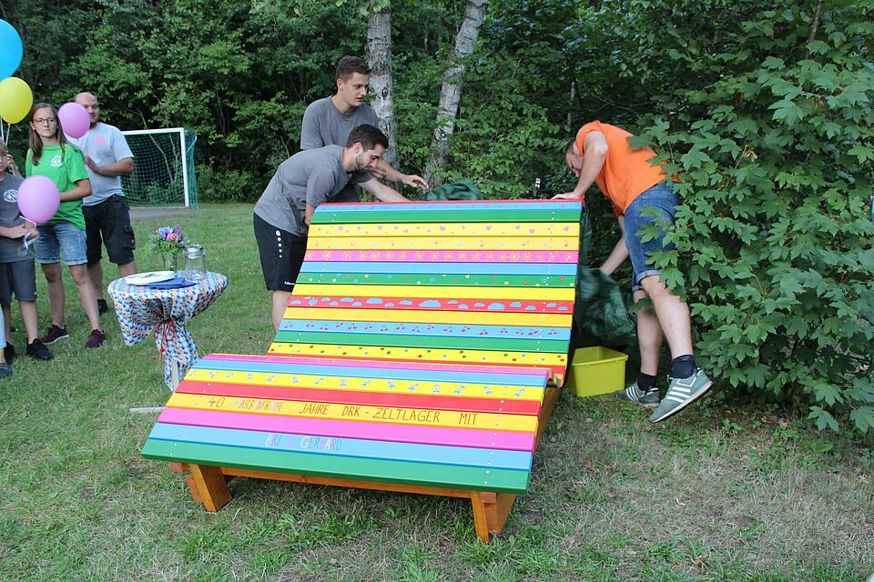 Mit einem eigens gedichteten Lied und vielen Luftballons starteten sie zusammen mit der Betreuerschar in den Jubiläumsabend. Eine bunte Ruhebank machten sie der Lagerleitung zum besonderen Geschenk. In einem Album gratulierten ehemalige Kinder, Betreuer und deren Eltern. Für den DRK Kreisverband bedankte sich der stellvertr. Geschäftsführer Stefan Wolf und überreichte einen Theatergutschein.