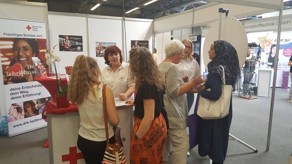 Zu eifrigen Gesprächspartnern werden an den 3 Messetagen auch DRK- Mitarbeiterinnen aus der Pflege, der Kita und dem kaufmännischen Bereich. Möglichkeiten zum Absolvieren eines Praktikums werden aufgezeigt. „Ein Job im Büro wäre nichts für mich“, mein Lukas aus Neckarsulm. Gezielt hat er sich im Vorfeld schon Messestände ausgesucht, die er an diesem Tag besuchen will. Leider hat die Klasse nur wenige Stunden Zeit eingeplant. „Hier kann ich nachfragen was mich interessiert und den persönlichen Kontakt find ich klasse.“ Und schon muss er weiter, die Zeit drängt….