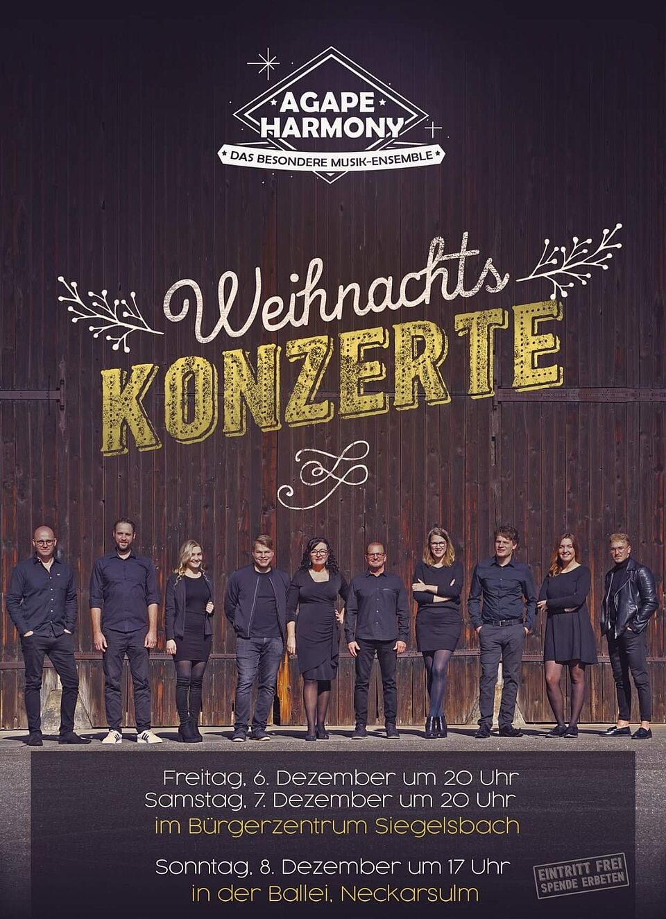 Das Ensemble Agape Harmony, singt auch in diesem Jahr wieder zugunsten eines wohltätigen Zwecks. Die von Wolfgang Kailer zusammengestellten, gesungenen Botschaften werden die Herzen der Zuschauer erreichen. Mit den Liedern lassen sich die Besucher auf die bevorstehenden Weihnachtstage ein. Sie sollen abschalten, den Trubel und die Hektik im Advent für ein paar Stunden hinter sich lassen.