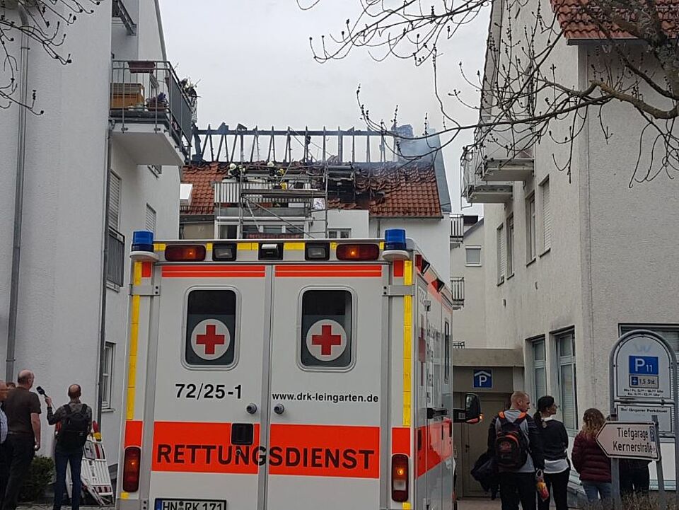 Gegen 16.30 Uhr ging ein Feueralarm über die Notrufnummer 112 bei der integrierten Leitstelle Heilbronn ein. Unmittelbar neben einem Weinsberger Pflegeheim würden meterhohe Flammen aus dem Hausdach eines Mehrfamilienhauses schlagen. Das gesamte Gelände war stark verraucht. Eine unmittelbare Gefährdung der Bewohner des benachbarten Pflegeheimes war nicht auszuschließen.