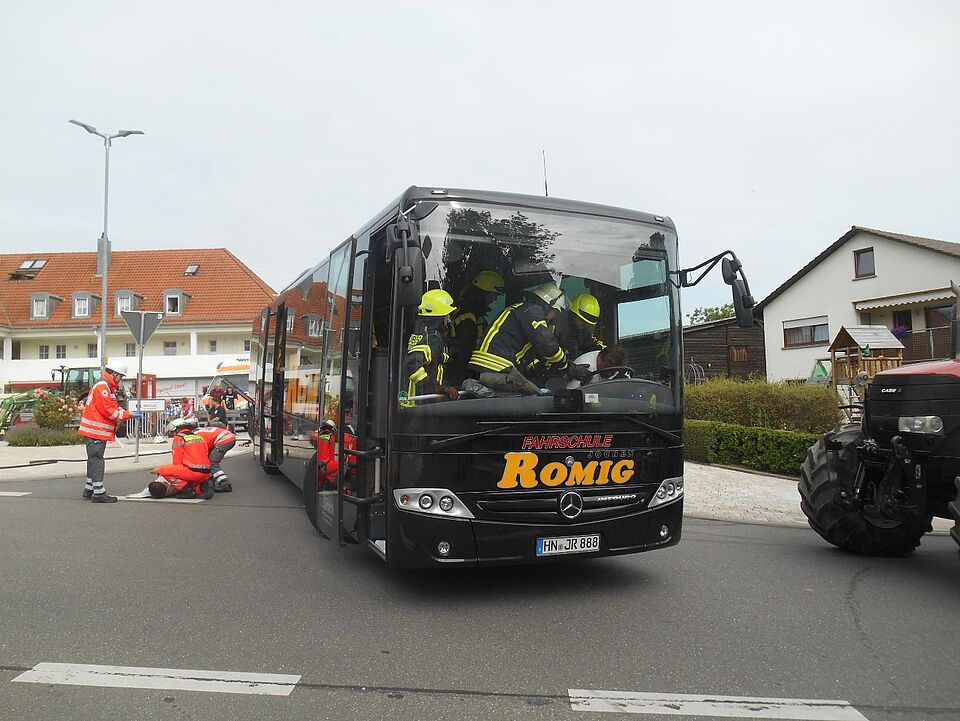 Eine gesperrte Straße, sehr viel Blaulicht und Martinshorn war vergangene Woche in Gemmingen anzutreffen. Anlass war die diesjährige Hauptübung zwischen Feuerwehr Gemmingen und DRK Ortsverein Gemmingen. Auf der Kreuzung Eppinger Straße/Eichmühlstraße war es zu einem Verkehrsunfall zwischen einem Reisebus und einem Traktor gekommen. Ein Bus wollte von der Eichmühlstraße in die Eppinger Straße einbiegen. Dabei übersah der Fahrer, ein von der Ortsmitte kommenden Traktor, der auf den Bus prallte. Der Motor im hinteren Bereich des Busses fing Feuer. Gleichzeitig konnte ein Auto hinter dem Traktor nicht mehr rechtzeitig bremsen und geriet unter den angehängten Pflug. Die Insassen wurden eingeklemmt.