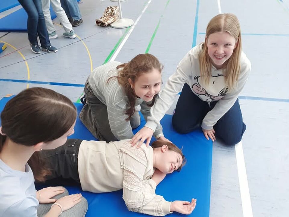 DRK Schulkoordinatorin Astrid Schmidt hat zusammen mit Jugendleiter Thomas Eger einzelne Stationen in der Sporthalle vorbereitet. Hier geht es um das Packen eines Notfallrucksacks, das Einüben der stabilen Seitenlage, Schock, Hitzschlag und vieles mehr. Mathea, Malin und Malea sind mit Eifer dabei. „Der Tag ist echt spannend,“ sagt Mathea und freut sich, dass sie nachher noch