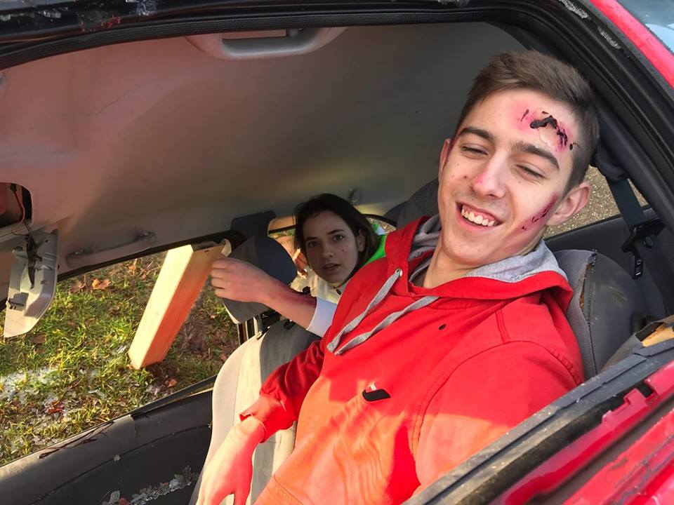 Alles „Top Secret“ – so die Anweisung des Kommandanten. Um 9 Uhr soll der Alarm rausgehen. Bis dahin müssen die Wunden realistisch dargestellt und die beiden Mimen ins Unfallfahrzeug verfrachtet werden. Nach einer kurzen Besprechung geht´s los, hierbei gilt es vor allem darum, die Sicherheit der beteiligten Mimen zu gewährleisten. Lukas legt seine Materialien zurecht und beginnt mit Dermawachs und verschiedenen Farben eine Unterarmfraktur zu schminken, der zweite Verletzte blutet ziemlich stark aus einer Stirnplatzwunde. Wichtig ist dem Schminker, das Geschehen so zu gestalten, wie es sich auch in der Realität hätte ereignen können. Die Mimen Marlene und Mike sind „alte Hasen“, wissen genau wie sie sich verhalten müssen und packen all ihre darstellenden Fähigkeiten in ihr Tun als „Opfer“.