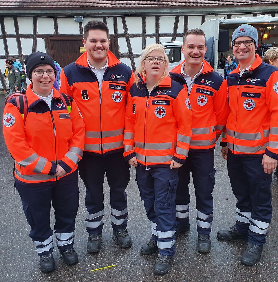 Neben Polizei und Feuerwehr sind auch Aktive der DRK Bereitschaft im Einsatz. Sie haben ihre verschiedenen Posten an der Wegstrecke bezogen, ein KTW und MTW stehen bereit.