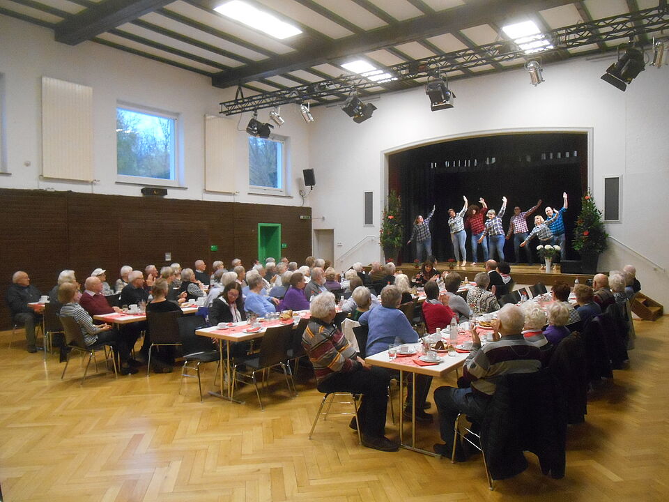 Im weiteren Verlauf des Nachmittags wurde das Programm von Mitgliedern des TSV Stetten mitgestaltet. In ihrem über einer halben Stunde dauernden Auftritt führten sie Auszüge aus dem Musical "Wahnsinn" mit Hits von Wolfgang Petry vor. Daraufhin wurde von den Helfern das Kaffeegeschirr abgeräumt und Brezeln und Getränke zur Stärkung auf den Tischen bereitgestellt. Weiter wurden von Klaus Hoffmann Gedicht von Heinz Erhardt vorgetragen, denen die Seniorinnen und Senioren gespannt lauschten.