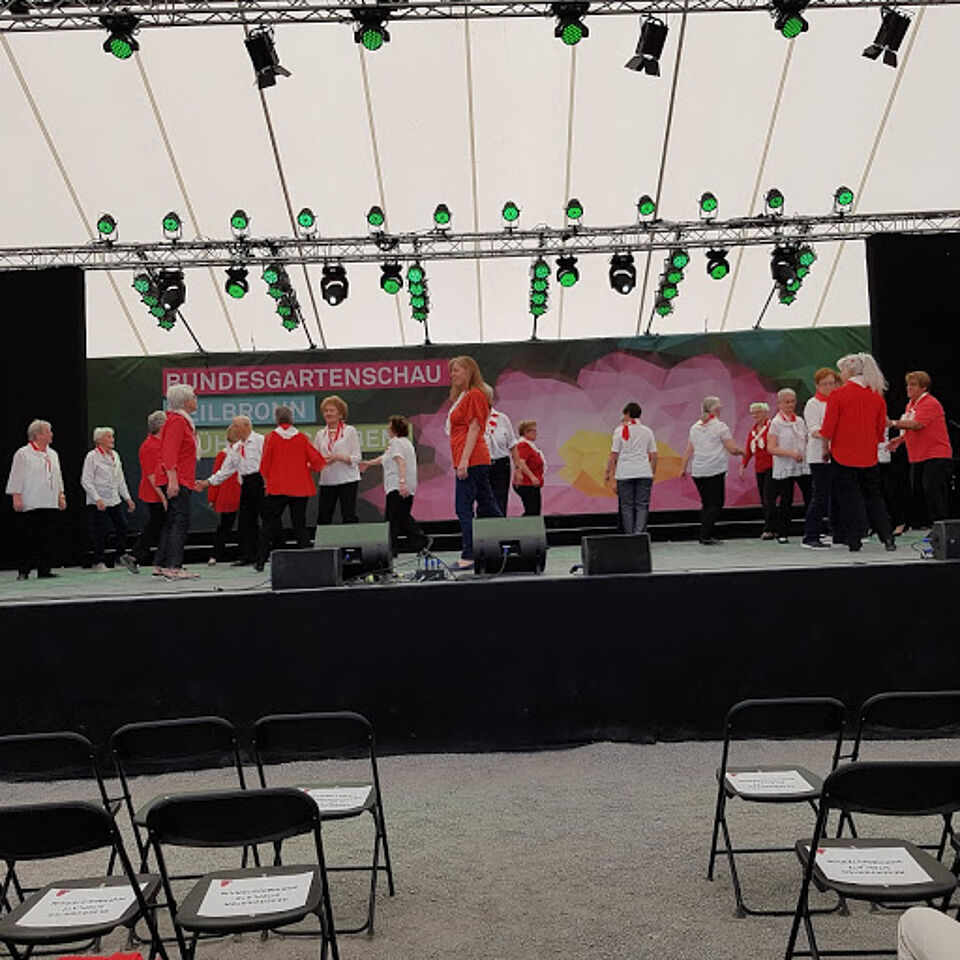 Im Rahmen des Blaulichttages trat am Nachmittag auch eine DRK Tanzgruppe aus Ilsfeld auf. Susanne Hofmann-Sütterle von der Sozialarbeit stellt diese und deren Leiterin Renate Vogt kurz vor.