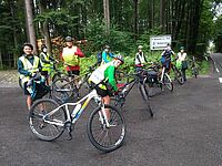 Ausgestattet mit Helm und Warnwesten sind die großen Jungs des Zeltlagers mit ihren Fahrrädern unterwegs.